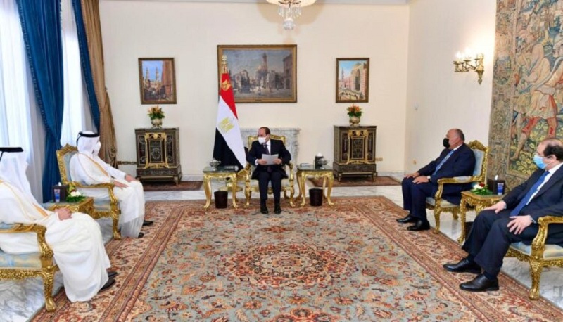 جاء ذلك خلال لقائه وزير الخارجية القطري في القاهرة، برفقة عبد الله الخليفي رئيس جهاز أمن الدولة القطري، في زيارة رسمية لمدة يومين.