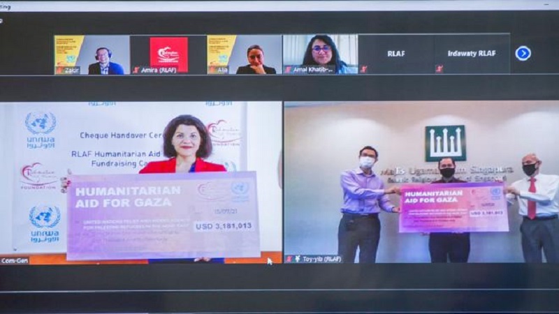 وتسلمت الشيك السيدة تمارا الرفاعي، مديرة العلاقات الخارجية بالإنابة والمتحدثة الرسمية بإسم الأونروا، من عيسى مسعود، الرئيس التنفيذي للمجلس الديني الإسلامي في سنغافورة، وفيصل عثمان، الرئيس التنفيذي لمؤسسة رحمة للعالمين، وفؤاد الشيخ أبو بكر مطر، رئيس مجلس إدارة مؤسسة رحمة للعالمين، وذلك خلال حفل افتراضي.