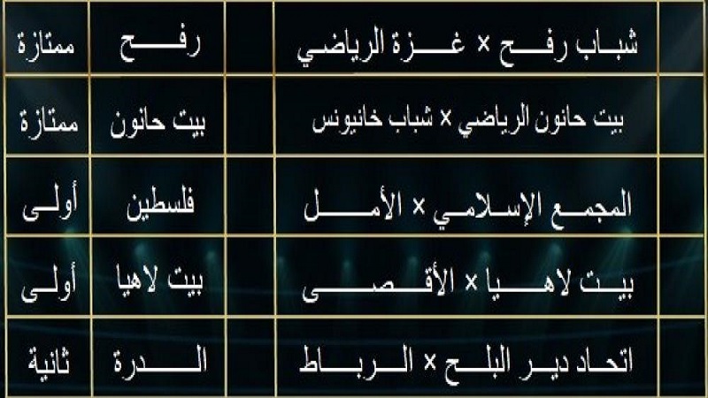 وفي أبرز المباريات، يتقابل شباب رفح مع غزة الرياضي، وبيت حانون الرياضي مع شباب خانيونس بالدرجة الممتازة، علمًا أن جميع المباريات تنطلق عند الساعة الثانية والنصف عصرًا بالتوقيت الشتوي في فلسطين.