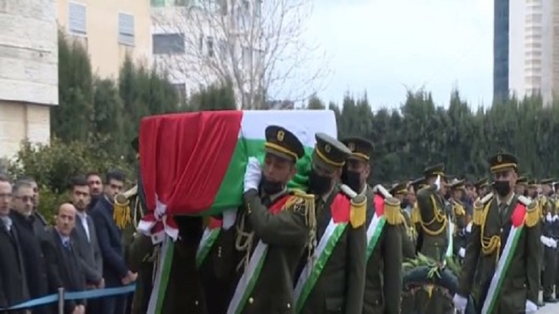 واصطف حرس الشرف أثناء وصول جثمان المناضل الكبير إلى مقر الرئاسة، وحُمل نعشه على الأكتاف، مرورا أمام ثلة من حرس الشرف، وعُزف النشيد الوطني الفلسطيني وموسيقى جنائزية.