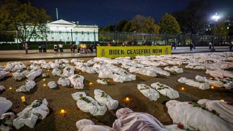 واشنطن: تظاهر عدد من موظفي منظمة العفو الدولية، أمام البيت الأبيض الأمريكي لدعوته وقف الحرب العدوانية التي يشنها جيش العدو الفاشي على قطاع غزة.