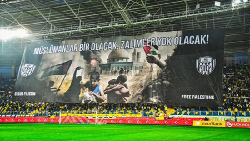 وقبل انطلاق المباراة بين فريقهم وألانيا سبور، ضمن منافسات الجولة الـ35 من الدوري التركي الممتاز لكرة القدم، رفعت جماهير فريق العاصمة صورة عملاقة لدعم فلسطين.