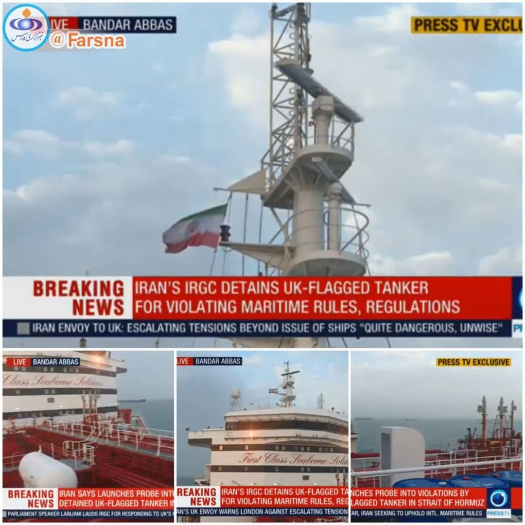 وكالات: نشرت قناة "برس تي في" الإيرانية فيديو يظهر رفع العلم الإيراني على الناقلة البريطانية "ستينا إمبيرو" المحتجزة من قبل الحرس الثوري الإيراني منذ الجمعة، بدعوى مخالفتها قوانين الملاحة.