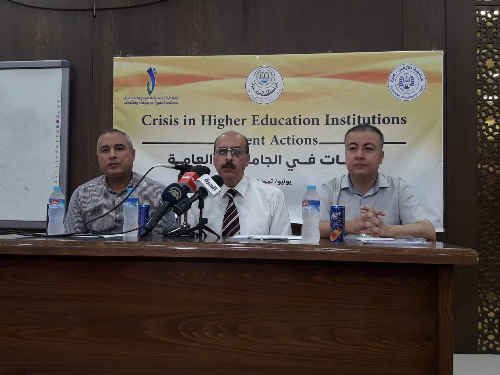 غزة: عقدت اللجنة المشتركة للجامعات الفلسطينية، والتي تضم كلًا من جامعة الأزهر، والإسلامية، وكلية العلوم التطبيقية، مؤتمرا صحافيا، عرضت خلاله واقع الضائقة المالية، التي تعاني منها الجامعات، منذ عشر سنوات.