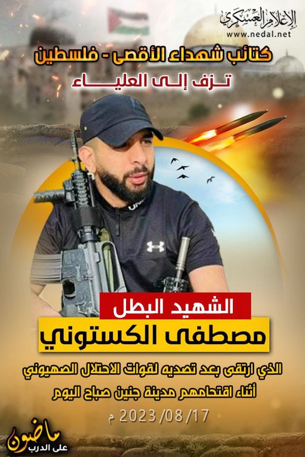 نعت كتائب شهداء الأقصى الجناح العسكري لحركة فتح شهيدها مصطفي الكستوني 32 عام والذي ارتقي اليوم الخميس، بعد إطلاق جيش الاحتلال الرصاص الحي عليه وإصابته في الرأس الصدر والبطن خلال اقتحامه لجنين.".