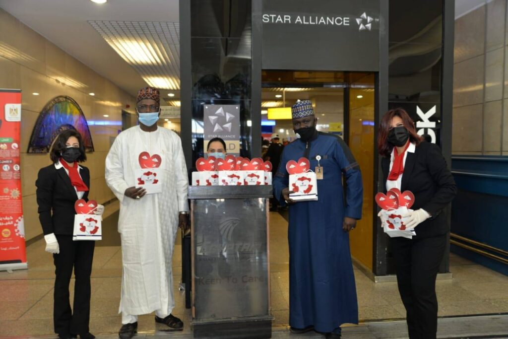 وقدم فريق العمل بـمصر للطيران، الهدايا التذكارية وكروت التهنئة للمسافرين، وسط التزام بكافة التدابير الاحترازية للوقاية من فيروس كورونا، بالإضافة إلي إضفاء مظاهر المناسبة في استراحات السفر وعلي متن الطائرات.