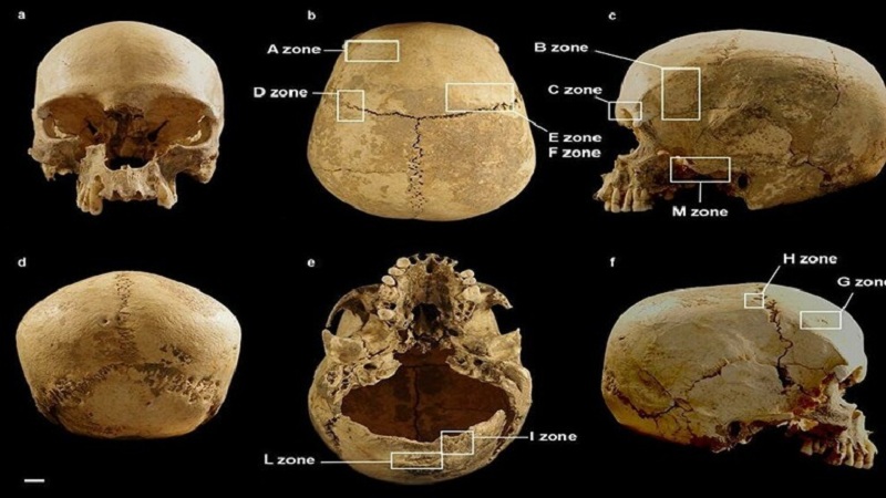 واكتشف الباحثون، عدة خدوش على الجمجمة، ناتجة عن إزالة الأنسجة الرخوة بعد الوفاة كجزء من الطقوس الجنائزية، وكذلك ترسبات معدنية على العظام، تشير إلى أن الجمجمة تعرضت خلال فترة طويلة لتأثير المياه. وأظهر تحليل هذه الترسبات، أن الجمجمة كانت مدفونة في مكان آخر.
