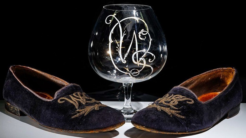 الحذاء المخملي الأزرق، يعود إلى خمسينات القرن الماضي، ويحمل في مقدمته الأحرف الأولى من اسم تشرشل "WSC"، وكوب خاص لشراب البراندي والذي يحمل أيضا أحرف اسم تشرشل.
