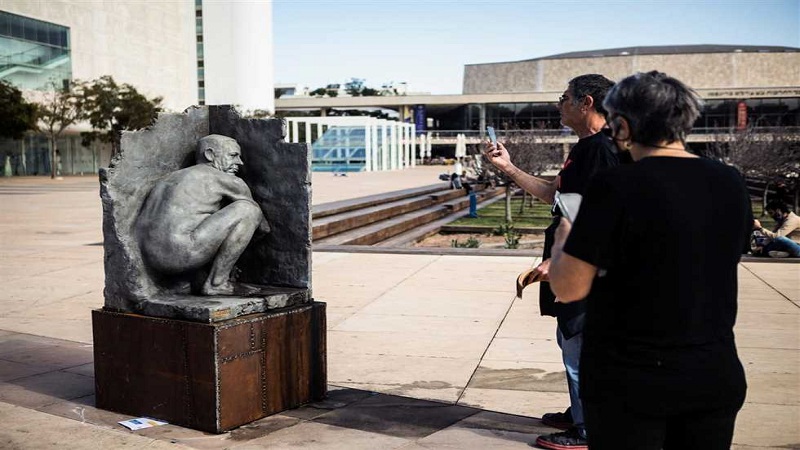 تل أبيب: عثرت الشرطة الإسرائيلية، اليوم الأربعاء، على تمثال برونزي، يظهر فيه رئيس الوزراء بنيامين نتنياهو وهو عارٍ، بوضعية القرفصاء، وسط مدينة تل أبيب.