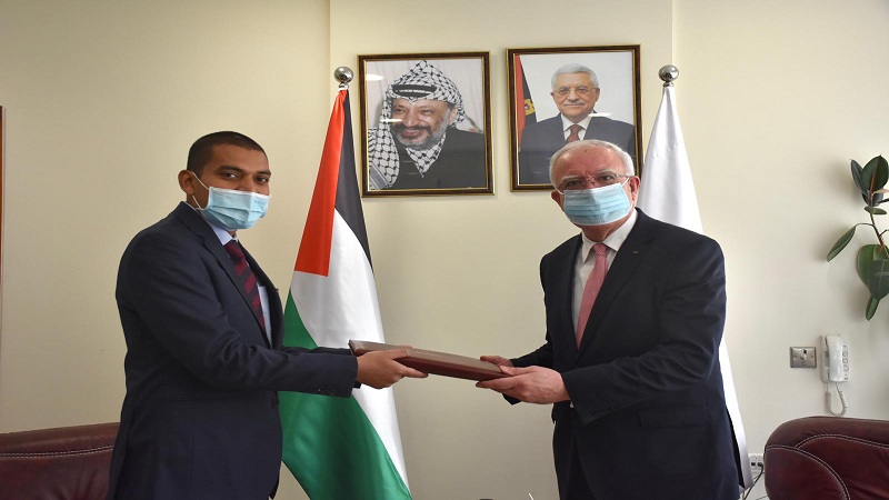 رام الله: تسلم وزير الخارجية والمغتربين، د. رياض المالكي، نسخة من أوراق اعتماد ممثل الجمهورية الهندية الجديد لدى دولة فلسطين، السفير موكل ارايا.