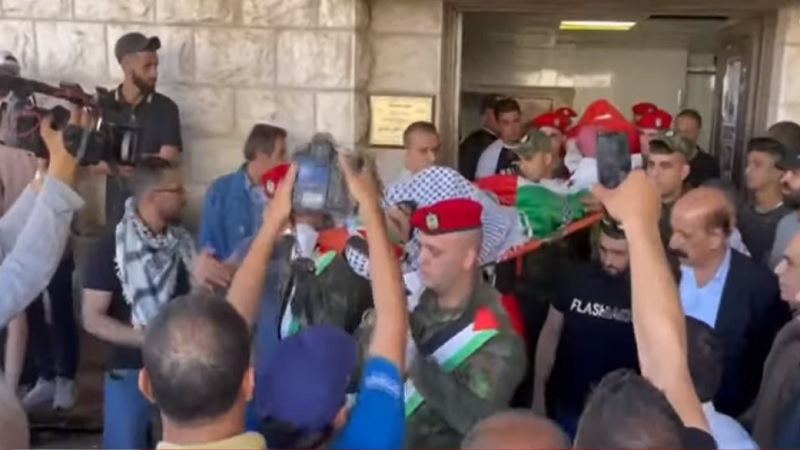 وردد المشيعون هتافات منددة بجرائم الاحتلال في حق الشعب الفلسطيني.