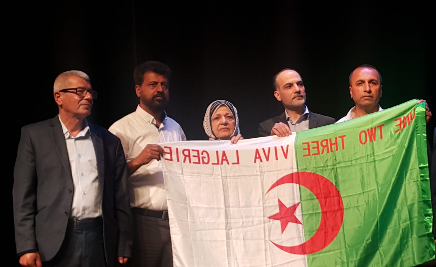 بالصور|| زوجة المناضل محمود بكر حجازي تحتضن العلم الجزائري في حفل تأبينه