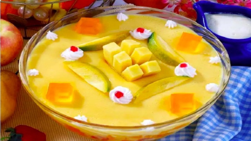 3. أخيرًا أضيفي بعض الفواكه المفرومة مثل التفاح والموز والمانجو والعنب. تُخلط جيداً وتترك حتى تبرد في الثلاجة. بمجرد أن تبرد، يصبح الكاسترد جاهزًا للتقديم.