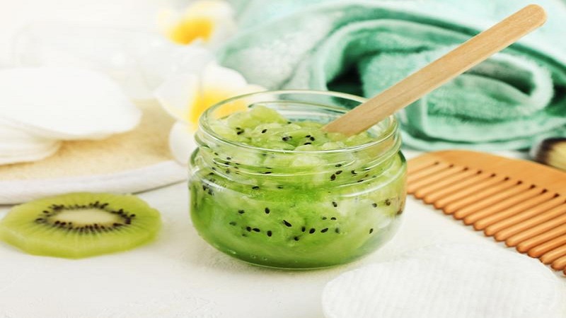مضاد لحب الشباب: تحتوي فاكهة الكيوي على مجموعة متنوعة من أحماض ألفا هيدروكسي والمواد المضادة للالتهابات التي تحارب حب الشباب، وتنظف المسام لتخفيف ظهور المزيد من الحبوب على الجلد، ويتم ذلك من خلال فاكهة الكيوي المهروسة، التي تستخدم كماسك فتوضع على الجلد.