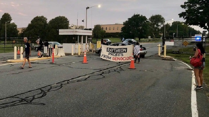 ونجح المتضامنون، بتعطيل العمل في شركة "رايثيون" لمدة 5 ساعات، حين قام متظاهران بتقييد نفسيهما بالمركبات التي أغلقت بوابات ومداخل الشركة ومنعت وصول الموظفين إليها، حيث جرى اعتقالهما لاحقا.