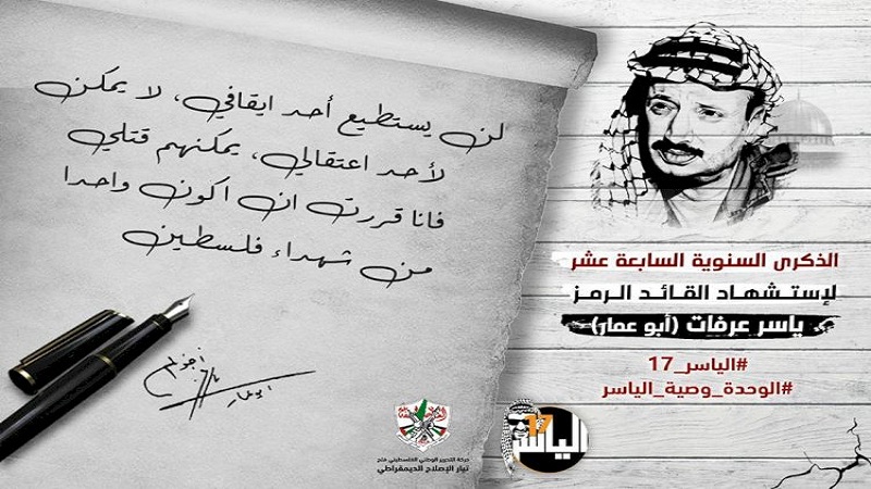 ورغم مرور سنوات طويلة، على استشهاده، إلا أن عرفات ما يزال حاضرًا في تفاصيل المشهد الفلسطيني، حيث يعتبره الكثيرون، الأب الروحي لقضيتهم الوطنية.