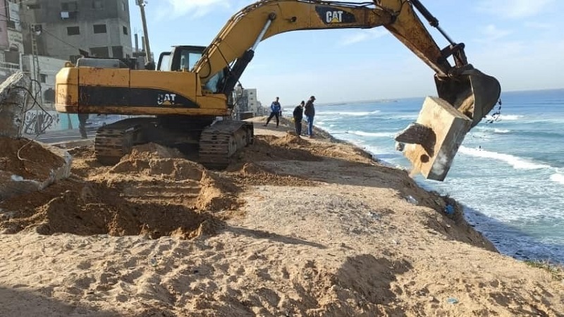 بالصور.. أعمال تدعيم لشارع الرشيد بسبب انهيار في منطقة مخيم الشاطئ