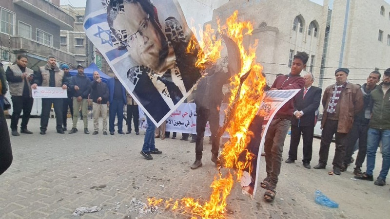 بالصور.. متظاهرون يحرقون صورا لقادة الاحتلال في خانيونس