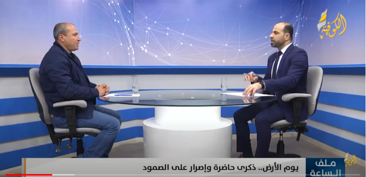 وأضاف في برنامج "ملف الساعة" على شاشة قناة "الكوفية"، أن هبة يوم الأرض جسدت وحدة الشعب الفلسطيني في الداخل المحتل مع باقي المناطق الفلسطينية المحتلة، وفضحت الرواية الإسرائيلية الرامية لتصفية الوجود الفلسطيني في الداخل أمام دول العالم أجمع، معتبرا أن يوم الأرض شكل نموذجا وطنيا موحدا بين كل أبناء شعبنا في كل مكان.
