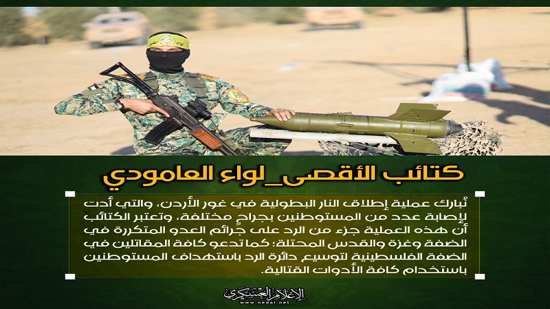 غزة: باركت كتائب شهداء الأقصى ، "لواء الشهيد القائد نضال العامودي" ،عملية إطلاق النار البطولية في غور الأردن، والتي أدت لإصابة عدد من المستوطنين بجراحٍ مختلفة، وتعتبر الكتائب أن هذه العملية جزء من الرد على جرائم العدو المتكررة في الضفة وغزة والقدس المحتلة.