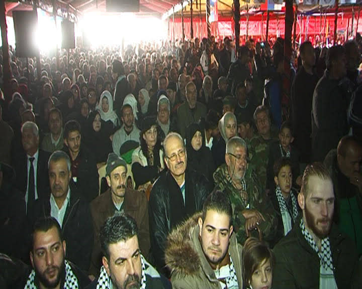 بدأ الحفل  بالنشيدين الفلسطيني والسوري، واختتم بتوزيع الدروع التكريمية والمساعدات على أسر  الشهداء الذين شاركوا في الدفاع عن المخيمات الفلسطينية في سوريا، إضافة لتوزيع المساعدات المقدمة من جمهورية الشيشان، بعد عدد من الكلمات التي ألقاها عدد من ممثلي الفصائل على رأسهم أحمد جبريل الأمين العام للجبهة الشعبية لتحرير فلسطين القيادة العامة.