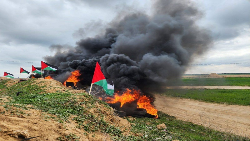 صور|| شبان يشعلون الإطارات المطاطية على الحدود الشرقية جنوب القطاع