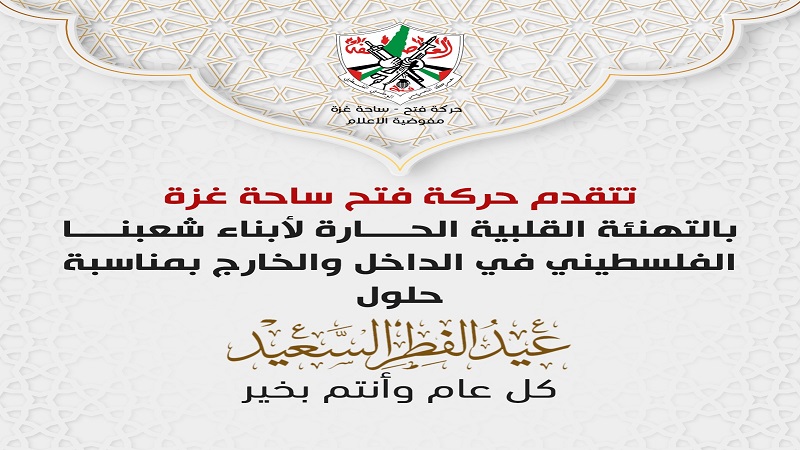 حركة فتح بساحة غزة تهنىء شعبنا والأمتين العربية والإسلامية بحلول عيد الفطر المبارك