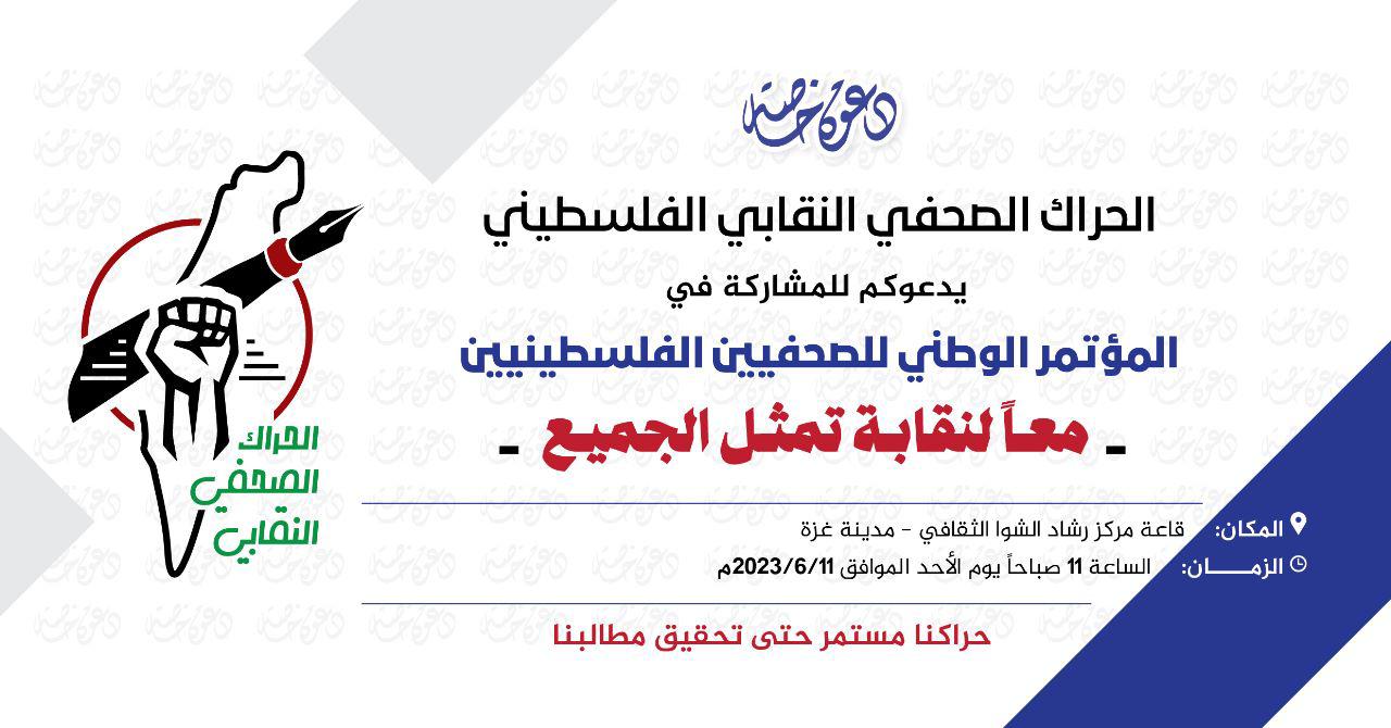 ويدعو الحراك الصحفي النقابي الفلسطيني كآفة الأطر والكتل الصحفية، والشخصيات الإعلامية من مختلف التوجهات، للمشاركة في فعاليات المؤتمر الوطني، لتصويب المسار النقابي ولانتزاع حقوق الصحفيين في نقابة مهنية تمثل الجميع، بعيدًا عن سياسة الإقصاء والتفرد.