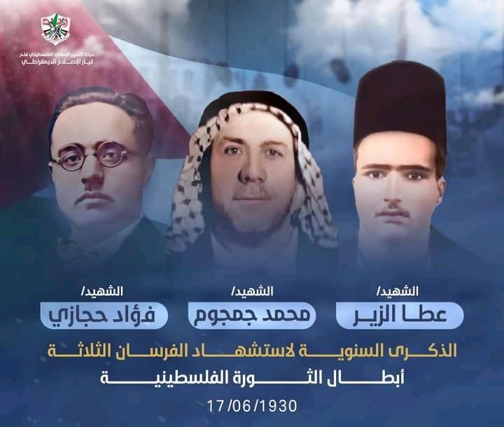 رام الله: تصادف اليوم، الـ17 من حزيران/يونيو، الذكرى الـ93 على إعدام سلطات الانتداب البريطاني المناضلين الثلاثة محمد جمجوم، وفؤاد حجازي، وعطا الزير.