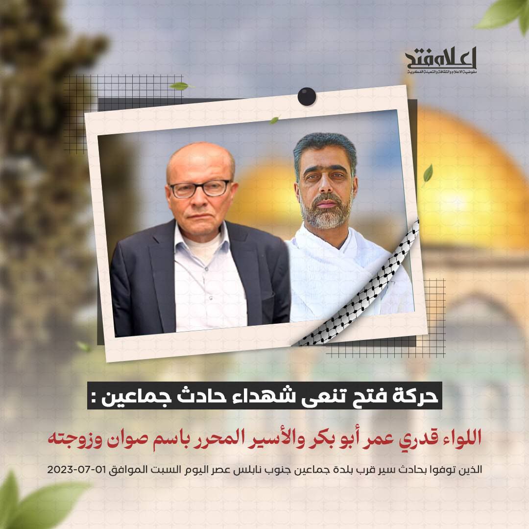 ونعى تيار الإصلاح الديمقراطي في حركة فتح اليوم السبت، اللواء قدري أبو بكر، رئيس هيئة شؤون الأسرى والمحررين، والأسير المحرر باسم صوان وزوجته، الذين تُوفوا إثر حادث سيرٍ مؤسفٍ قرب جماعين جنوب محافظة نابلس.