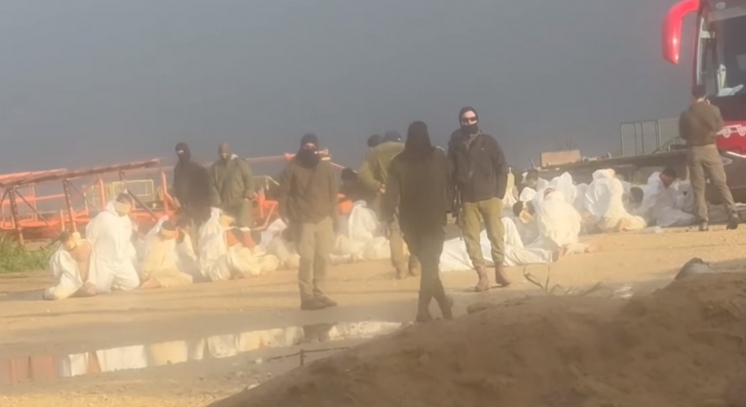 وتُظهر اللقطات أكثر من 20 مواطنا يرتدون ملابس بيضاء، ويُجبرون على الركوع على الأرض من قِبل الجنود الإسرائيليين، وأيديهم وأعينهم مقيدة.