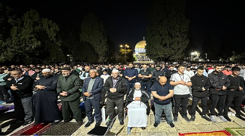 القدس المحتلة: أدى آلاف المواطنين صلاتي العشاء والتراويح في رحاب المسجد الأقصى المبارك، رغم قيود وتضييقات الاحتلال الإسرائيلي.