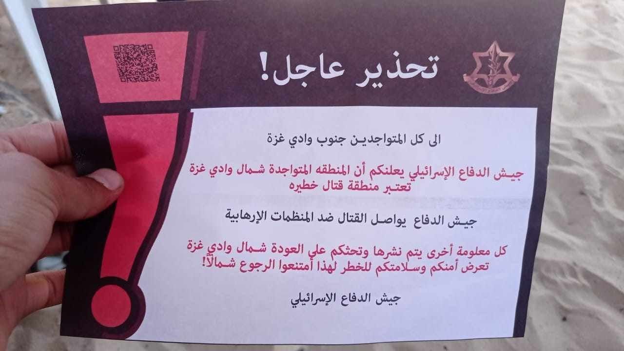 وجاء في المنشور: "إلى كل المتواجدين جنوب وادي غزة، جيش الدفاع الإسرائيلي يعلمكم أن المنطقة المتواجدة شمال وادي غزة تعتبر منطقة قتال خطيرة".