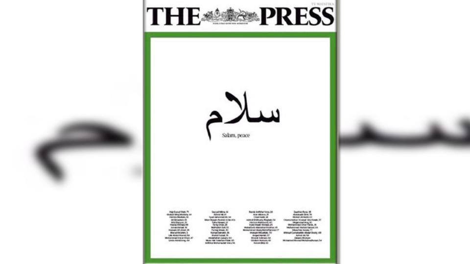 متابعات: نشرت صحيفة "ذا برس" النيوزيلندية، اليوم الجمعة، على صفحتها الرئيسية، كلمة "السلام" بالحروف العربية فوق أسماء 50 مسلماً قتلوا في هجوم الجمعة الإرهابي.