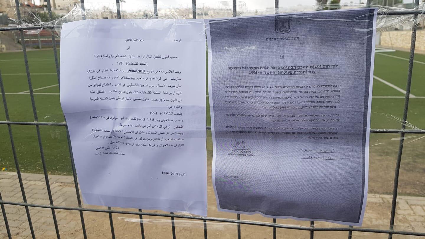 وقال شهود عيان، إن المنع بحسب القرار الذي ألصقه جيش الاحتلال على مدخل الملعب "بسبب تنظيم البطولة لمناسبة يوم الأسير الفلسطيني".