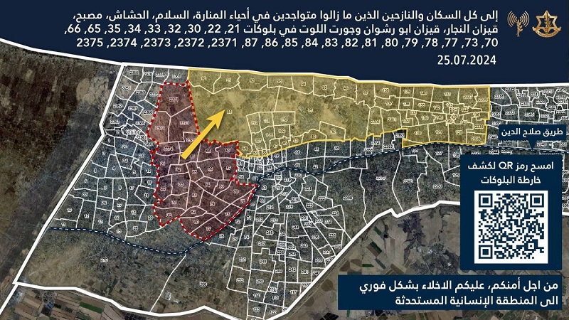 وقال جيش الاحتلال في بيان: "إلى سكان قطاع غزة المتواجدين في منطقة شمال خانيونس، وتحديدًا في بلوكات 2352, 2353, 2354, 2355, 2270".