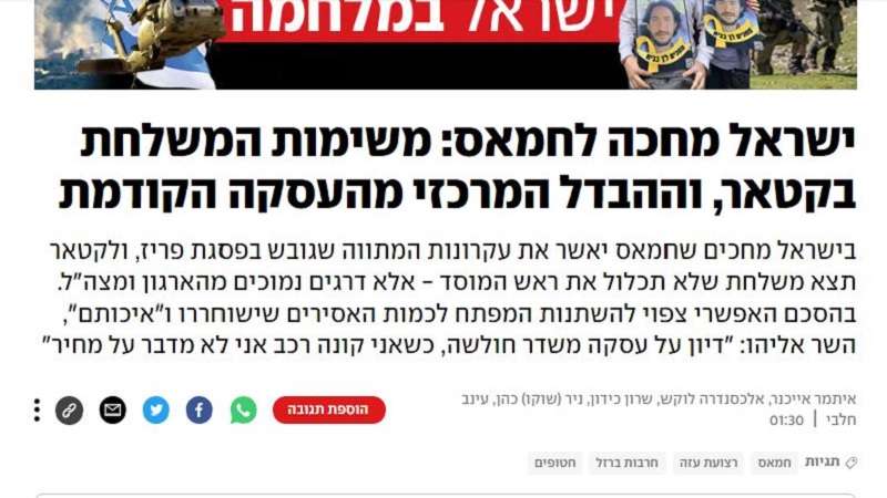 وزادت الصحيفة، انه لا يزال هناك شعور بالتفاؤل الحذر بين أعضاء الفريق المفاوض بشأن المفاوضات، ويتحدثون عن أنه رغم رفض حماس تقديم قوائم المختطفين، إلا أن الطرفين تمكنا من إحراز تقدم في الموضوع ويعتقد فريق التفاوض أنه خلال أسبوع على الأكثر سيكون من الممكن فهم ما إذا كان سيتم التوصل إلى اتفاق أم لا.