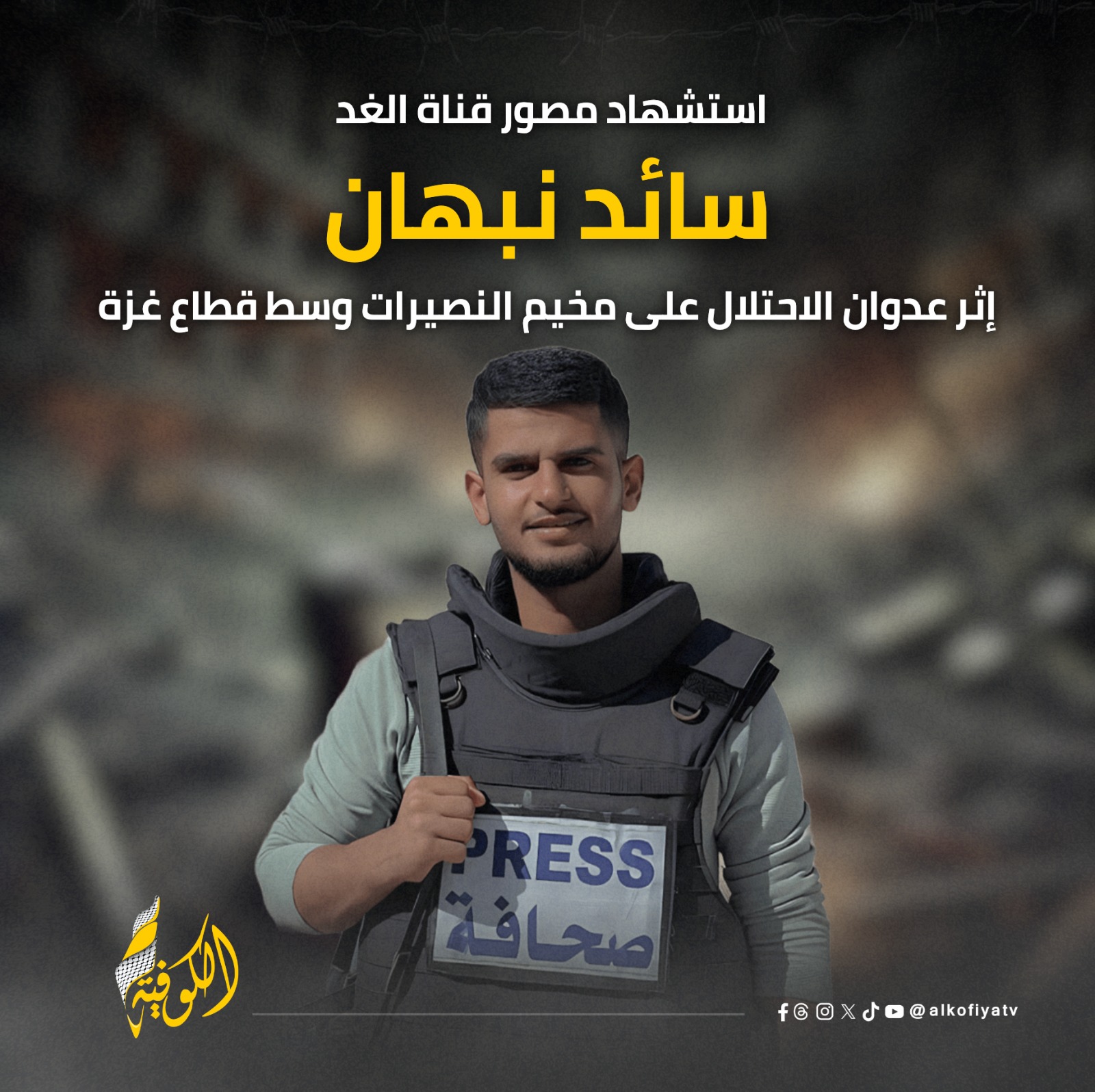 ونعت قناة الغد مصورها الصحفي سائد نبهان الذي ارتقى برصاص جيش الاحتلال خلال تغطيته العدوان المستمر على مخيم النصيرات.
