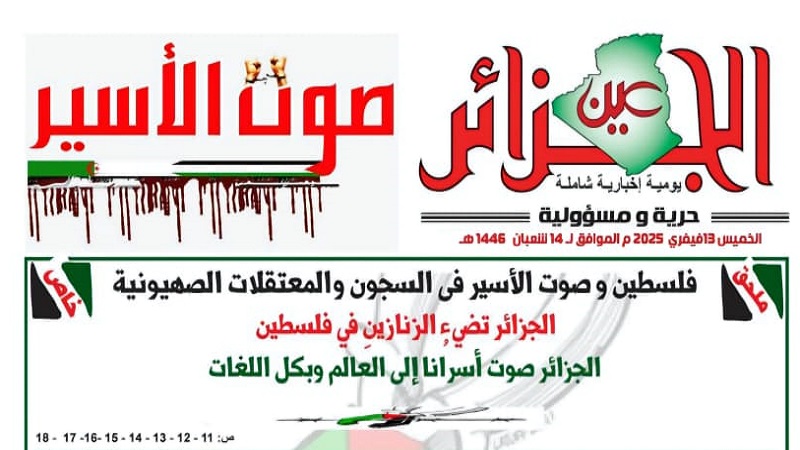 الجزائر: من جديد تتميز صحيفة "عين الجزائر" وكعادتها في نصرة الأسير الفلسطيني. حيث أصدرت صحيفة "عين الجزائر" يوم الخميس الموافق 13/02/2025 الملحق "الثالث عشر" من (صوت الأسير) بالتنسيق والتعاون بين الصحيفة وسفارة دولة فلسطين بالجزائر وبأشراف  الأخ «خالد صالح" "عز الدين"