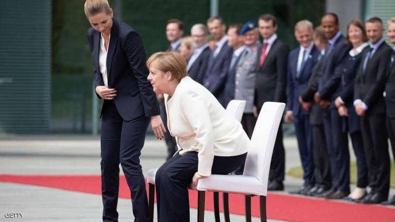 برلين: جلست المستشارة الألمانية أنجيلا ميركل، ورئيسة الوزراء الدنماركية خلال عزف السلام الوطني للبلدين في حفل أقيم في برلين، بعد يوم واحد من إصابة الأولى برعشة أثناء وقوفها في حدث مماثل، في واقعة كانت الثالثة من نوعها خلال شهر.