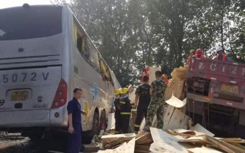 وذكرت شرطة مدينة يتشينغ بإقليم جيانغسو، أن الحافلة التي كان تسافر شمالا اخترقت حاجزا يفصل بين الحارتين على طريق سريع واصطدمت بشاحنة تقل ثلاثة أشخاص كانت تسير في الاتجاه المعاكس.