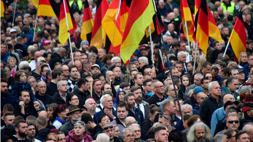 برلين: تظاهر الآلاف، في مدينة بيليفيلد غربي ألمانيا، اليوم السبت، ضد مسيرة للنازيين الجدد.