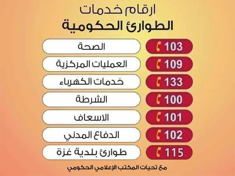 غزة: نشر المكتب الإعلامي الحكومي في قطاع غزة، أرقام الطوارئ للمواطنين.