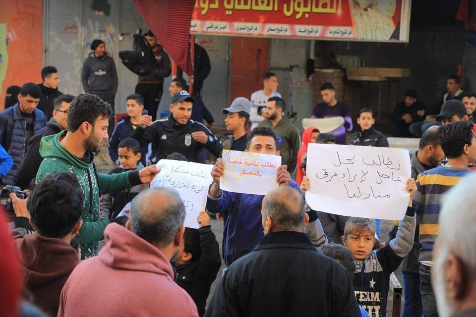 غزة: داخل مخيم جباليا شمال قطاع غزة، اليوم الأحد، فعالية شعبية احتجاجًا على إغراق مياه الأمطار لمنازل المواطنين بشكلٍ متكررٍ، جراء المنخفضات الجوي.
