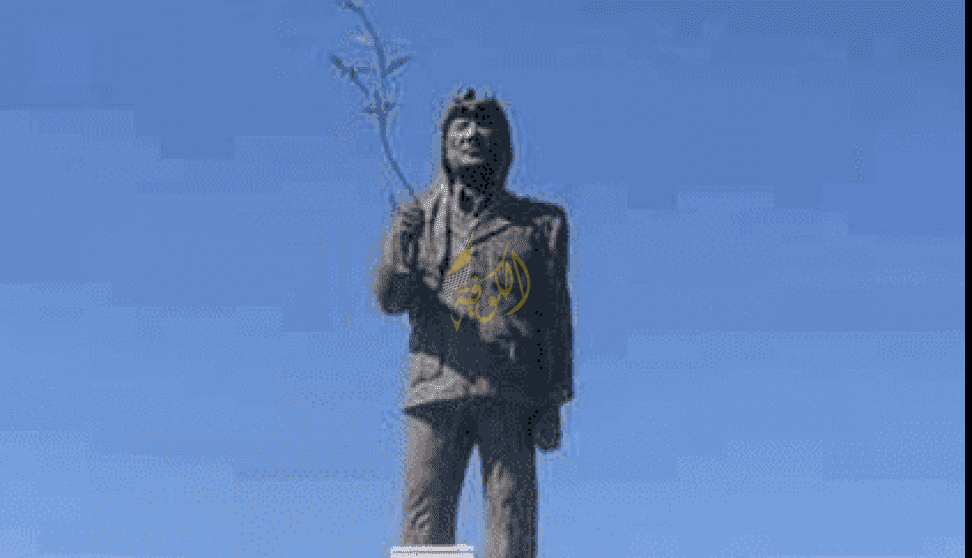 التمثال البرونزي الذي يمثل "أبو عمار" حاملا غصن زيتون، يقف فوق قاعدة من الخام حفر النحات عليها كلمات تذكير بالقرار الرقم 181 الصادر عن الأمم المتحدة بإعطاء الفلسطينيين أرضا لإقامة دولة مستقلة عليها.