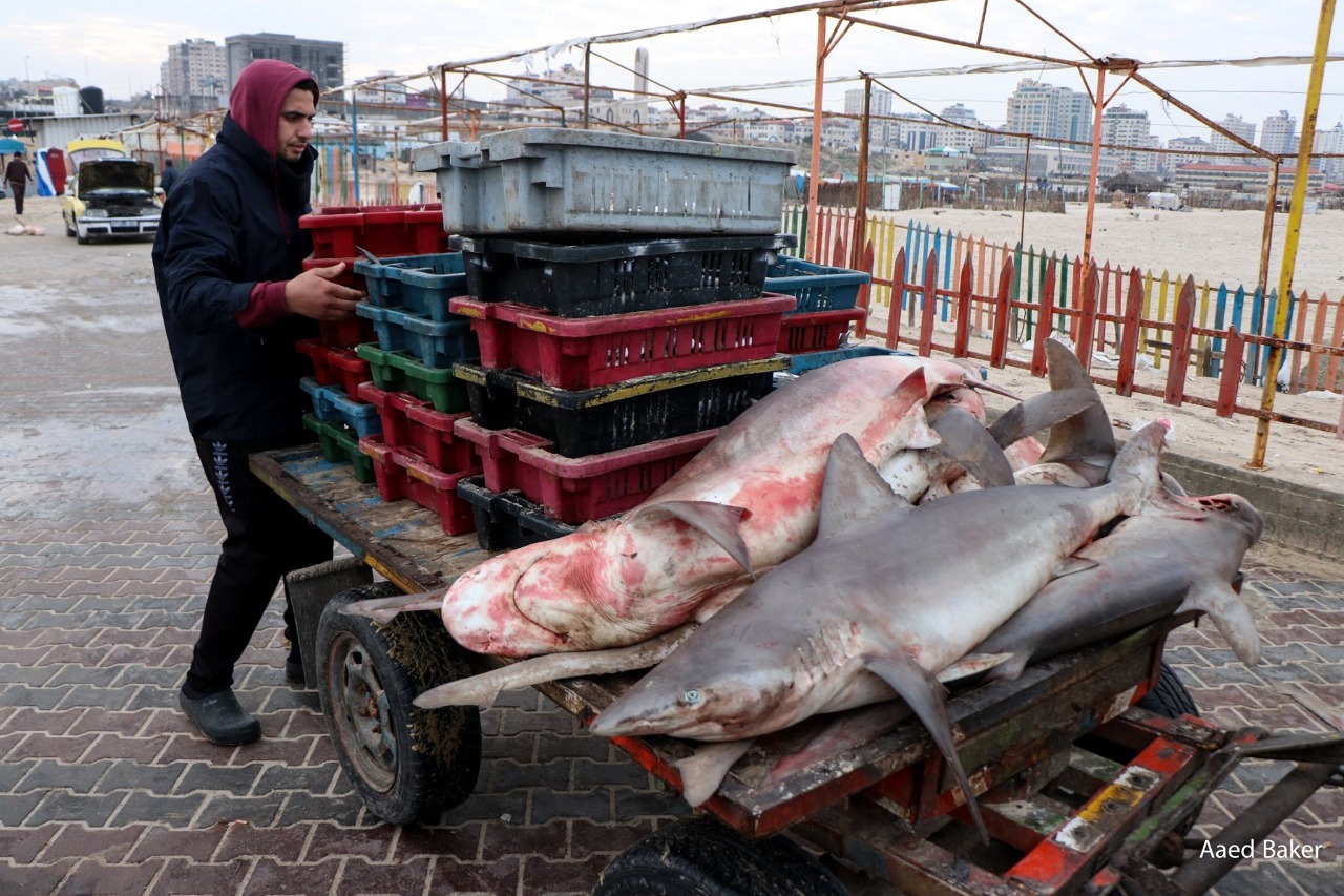 وفي حدث نادرا ما يتكرر، دفع منخفض جوي، أسماك القرش إلى غزة، ليقوم الصيادون باصطيادها وبيعها للمواطنين.