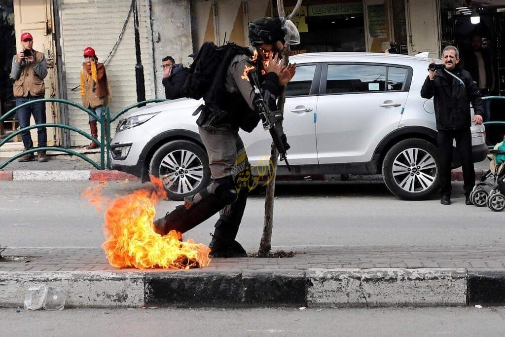وأفادت مصادر محلية، أن النار اشتعلت بأحد جنود جيش الاحتلال بعد أن ألقى عليه الشبان زجاجة حارقة، خلال مواجهات في منطقة باب الزاوية، بمدينة الخليل.
