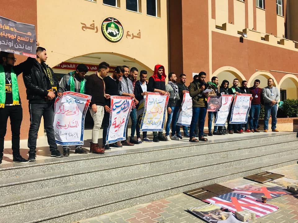 رفح: شاركت حركة الشبيبة الفتحاوية - ساحة غزة، اليوم الثلاثاء، في وقفة احتجاجية دعت لها الأطر الطلابية داخل في جامعة القدس المفتوحة - فرع رفح،رفضا لـ"صفقة ترامب".