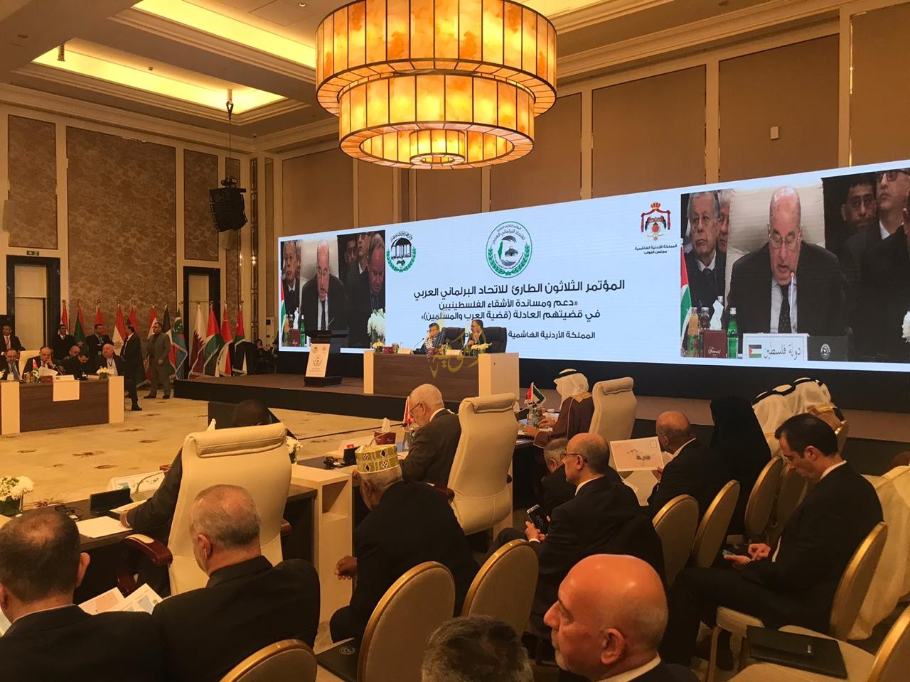 وأوضح، أن الشعب الفلسطيني وقيادته تعرضوا، وسيتعرضون في الأيام المقبلة للمزيد من الهجمات الشرسة، والابتزاز والضغوط والحصار المالي كوسيلةٍ لفرضٍ ما ورد في هذه الصفقة المشؤومة، داعيا البرلمانات العربية للعمل مع حكوماتها لتنفيذ شبكة الأمان المالية التي أقرتها القمم العربية لدعم شعبنا ومؤسساته، وتوفير الدعم المادي الكافي لتثبيت صمود المقدسيين في مدينتهم، تنفيذا لقرارات القمم العربية، وقرارات الاتحاد البرلماني العربي.