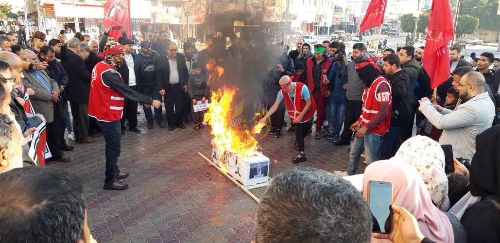 ورفعت في الوقفة الاحتجاجية الاعلام الفلسطينية ورايات الجبهة والشعارات واليافطات وسط هتافات منددة بـ«صفقة ترامب».
